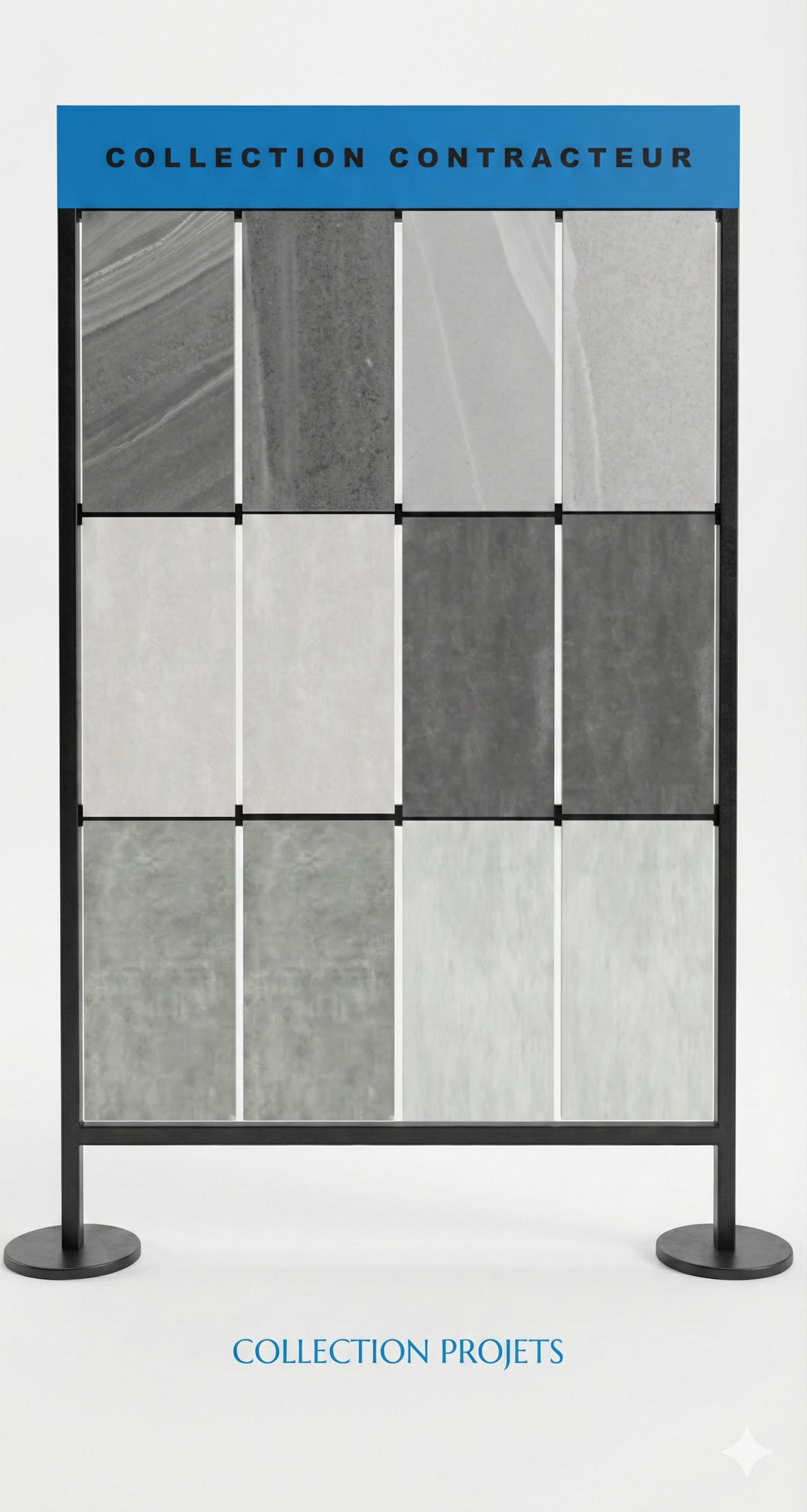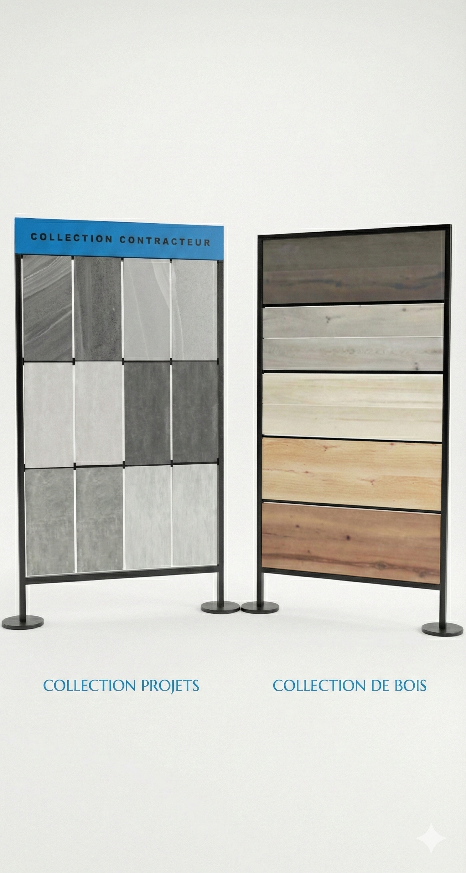 En misant sur la qualité de la présentation plutôt que la quantité, il améliore l’expérience client en salle de montre. Fini le collage des tuiles sur des panneaux et l’attente de plusieurs jours avant l’installation. Avec ce présentoir, vous êtes prêt à vendre en seulement deux minutes.